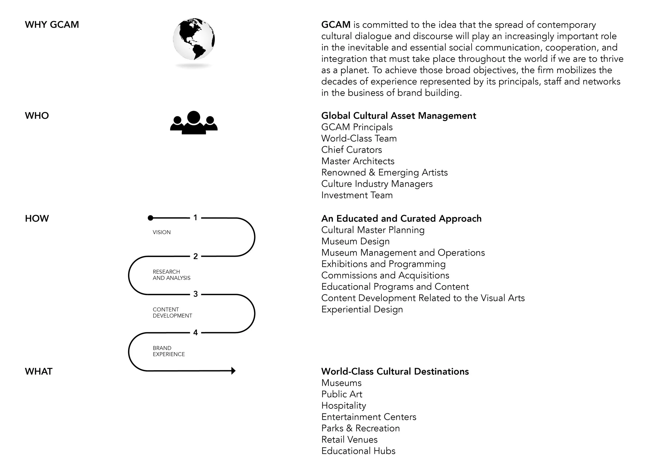 GCAM | Global Cultural Asset Management is a world-class international firm at the intersection of art, architecture, politics and economics. GCAM provides advice, expertise, and service for governments, institutions, corporations, foundations and individuals in six interceding service business lines related to the expansion of art, culture, and art museums in a global economy.